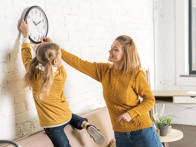 3、4歳には「針がここにくるまでに片づけよう」、5歳には「夕飯は○時だから、それまでに何がやれるかな」など見通しが持てるような声掛けを心がけて。「○時に寝るために頑張ろう」と連帯感を持つのも楽しく取り組めるコツだ。
