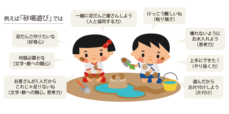 好奇心、協調性、自己主張、自己抑制、頑張る力などの「学びに向かう力(非認知能力)」を成長させるには、幼児期に遊び込んだ経験が重要であるという研究結果がある。