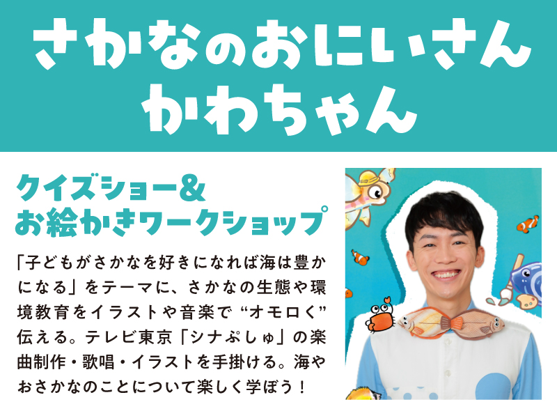 「子どもがさかなを好きになれば海は豊かになる」をテーマに、さかなの生態や環境教育をイラストや音楽で“オモロく”伝える。テレビ東京「シナぷしゅ」の楽曲制作・歌唱・イラストを手掛ける。海やおさかなのことについて楽しく学ぼう!
