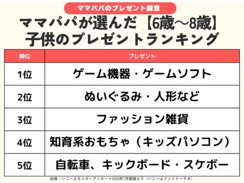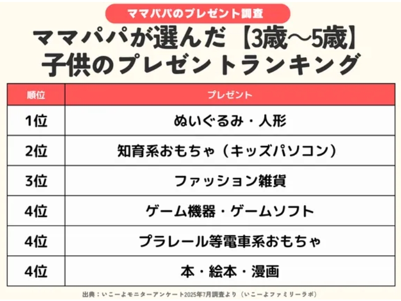国内最大級の子どもとお出かけ情報サイト「いこーよ」会員のパパ・ママ421人に聞いた、実際に贈った子どもへの誕生日プレゼントをランキング形式で、さらに具体的なコメントで見てみよう。