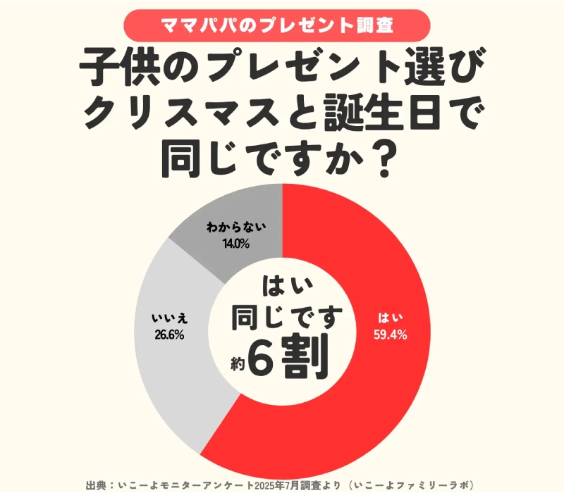 「子どものプレゼント選び、クリスマスと誕生日で同じですか?」という質問では、約6割が「同じ」、約3割が「違う」と回答。基本は子どもがほしいもの、喜ぶものがベースだろう。誕生日とクリスマスでは違うというパパ・ママは、次のような選び方をしているようだ。